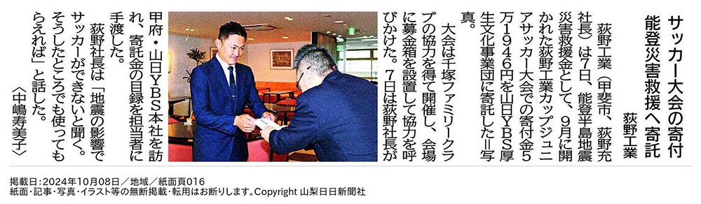 荻野工業カップジュニアサッカー大会での寄付金を山日YBS厚生文化事業団に寄託(能登半島地震災害救援金)いたしました